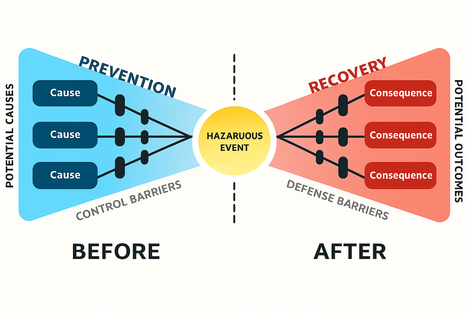 A Bowtie diagram is a visual risk assessment tool that illustrates the pathways from potential accident causes to the resulting consequences, and the controls (barriers) in place to prevent or mitigate those pathways. It gets its name from its shape: the diagram has a central “knot” representing a hazardous Top Event (e.g., a loss of containment or equipment failure), with causes depicted on the left side and consequences on the right, resembling a bow-tie. Each cause is connected to the top event by a Threat line, and along that line are preventive barriers intended to stop the cause from triggering the top event. Similarly, on the right side, each consequence has mitigating barriers to reduce its severity. This format creates one, easy-to-understand picture of a risk scenario. The left side focuses on proactive risk management (preventing the incident), while the right side focuses on reactive measures (limiting damage if it occurs). The power of the bowtie method is that it provides an overview of multiple credible scenarios and their safeguards in a single diagram, making complex risk information accessible at a glance.