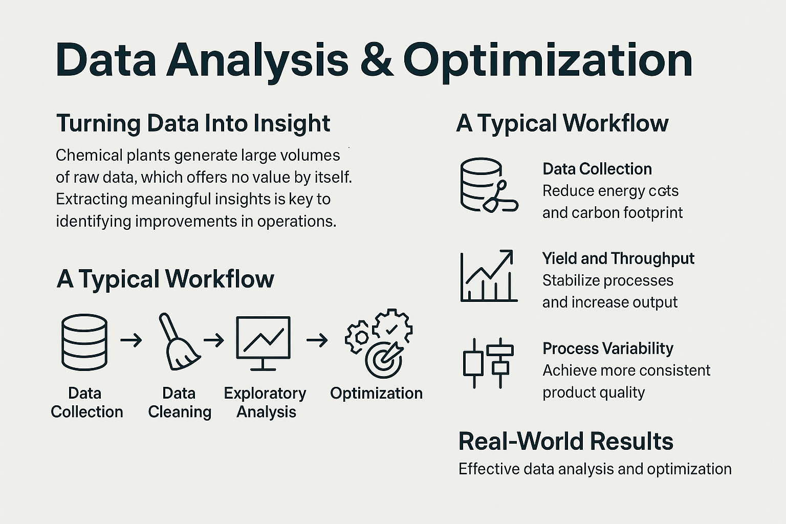 Modern chemical plants log millions of data points every day—temperatures, flows, assays, energy meters, maintenance notes. Until those numbers are interrogated with engineering context and analytical rigor, they remain little more than digital clutter. OSVARD’s Data Analysis & Optimisation service turns that clutter into a living playbook for higher yield, lower energy, tighter quality, and smarter maintenance.
