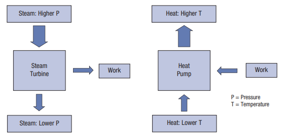The efficiency of a heat pump is not described in terms of thermal efficiency (as with heat engines) but by its “Coefficient of Performance (COP) –> the ratio of heat output to the work input”. The COP of a heat pump is always greater than 1, meaning that a heat pump transfers more heat than the work put into it. IHPs are used to capture low-grade waste heat and upgrade it to provide space or district heating, or for other industrial uses.