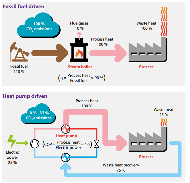 Fossil fuel-driven processes approximately lose about 10% of their heat to the environment, meaning 110% of the required heat is used. After usage, this heat, at too low a temperature for reuse, is entirely released into the ambient. In contrast, heat pump systems reduce waste heat to 25% of the demand. They reuse 75% of this waste heat by elevating its temperature, delivering 100% process heat while using only 25% electricity, achieving a 4 times efficiency. This efficiency, termed the coefficient of performance (COP), ranges from 2 to 5, varying with waste and process heat temperatures. (2)