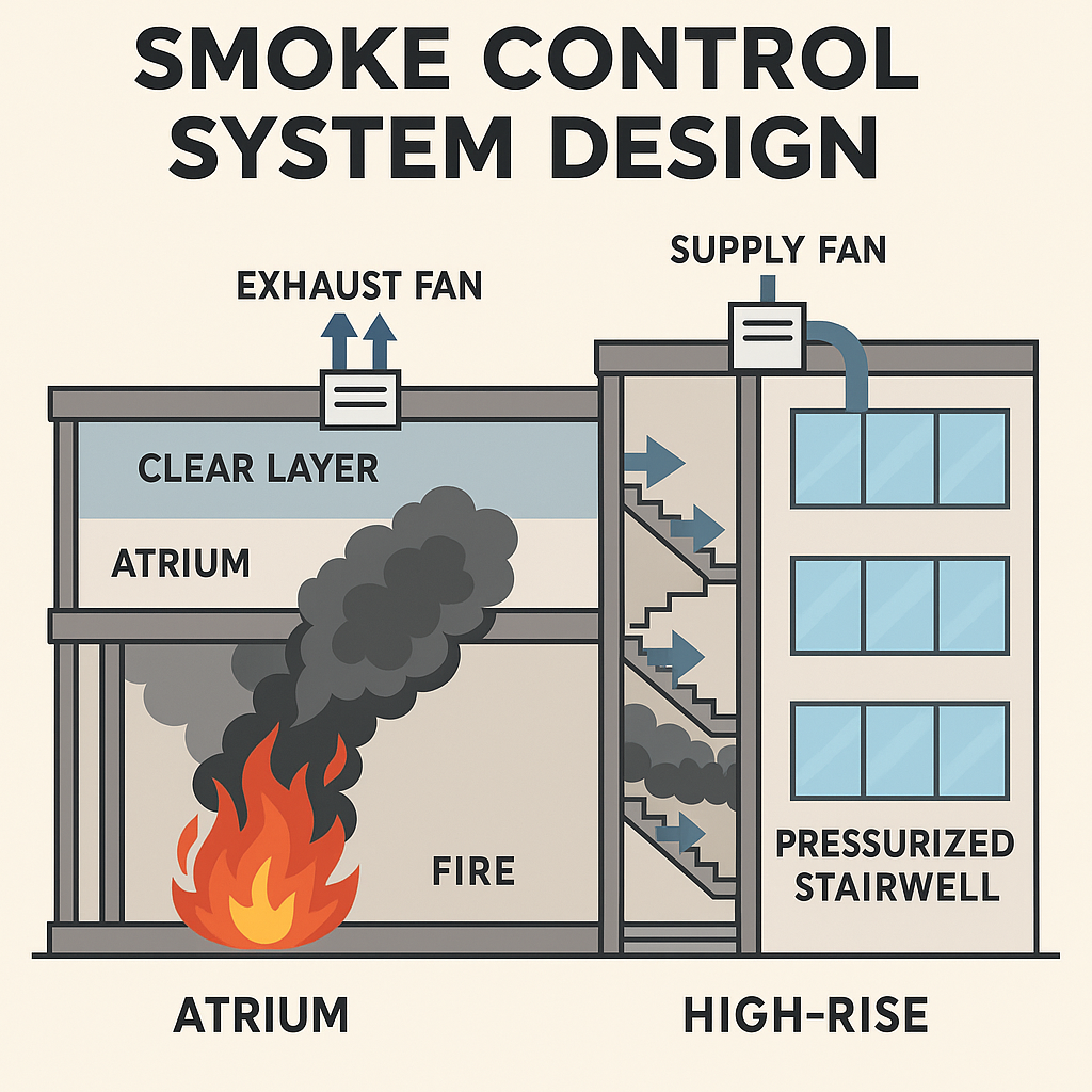 Reax Engineering – Smoke control systems in high-rises use the pressurization method: mechanical fans create a pressure difference to keep smoke confined to the fire zone and out of adjacent zones (e.g., keeping stairwells smoke-free)reaxengineering.com.